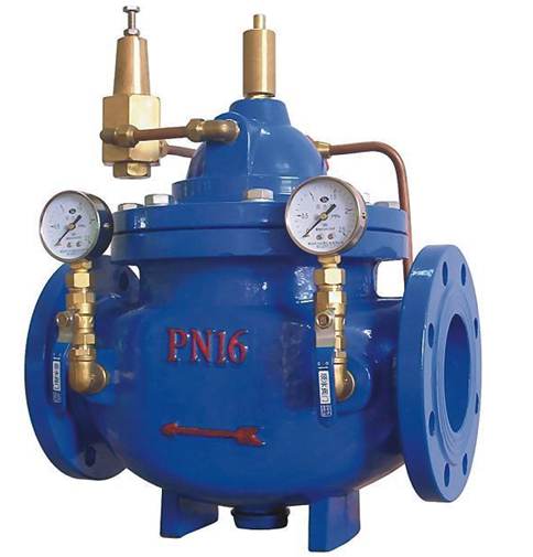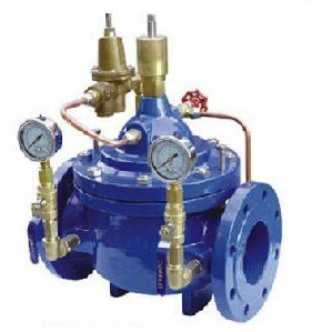 当阀门从进口端给水时,水流过针阀进入主阀控制室,出口压力通过导管作用到导阀上。当出口压力高于导阀弹簧设定值时,导阀关闭。控制室停止排水,此时主阀控制室内压力升高并关闭主阀,出口压力不再升高。 当阀门出口压力降到导阀弹簧设定压力时,导阀开启,控制室向下游排水。由于导阀系统排水量大于针阀的进水量,主阀控制室压力下降。进口压力使主阀开启。在稳定状态下,控制室进水、排水相同,主阀开度不变,出口压力稳定。